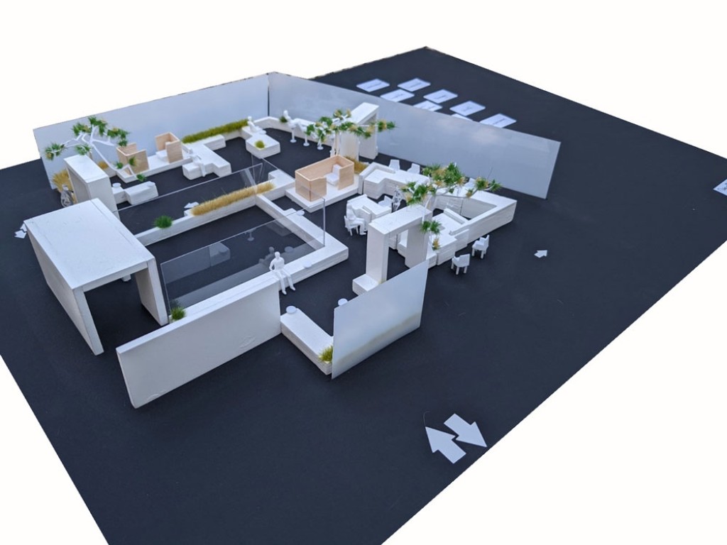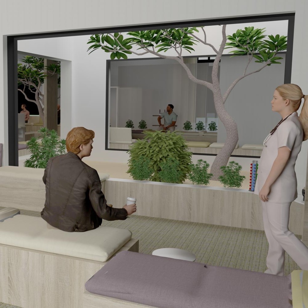 - Un mobilier sensible : intégration d’un chemin végétal guident les pas du patient. Mobilier sur-mesure en chêne massif, arches symboliques, assises modulables à différentes hauteurs — pour respecter les usages, favoriser l’échange ou l’isolement.