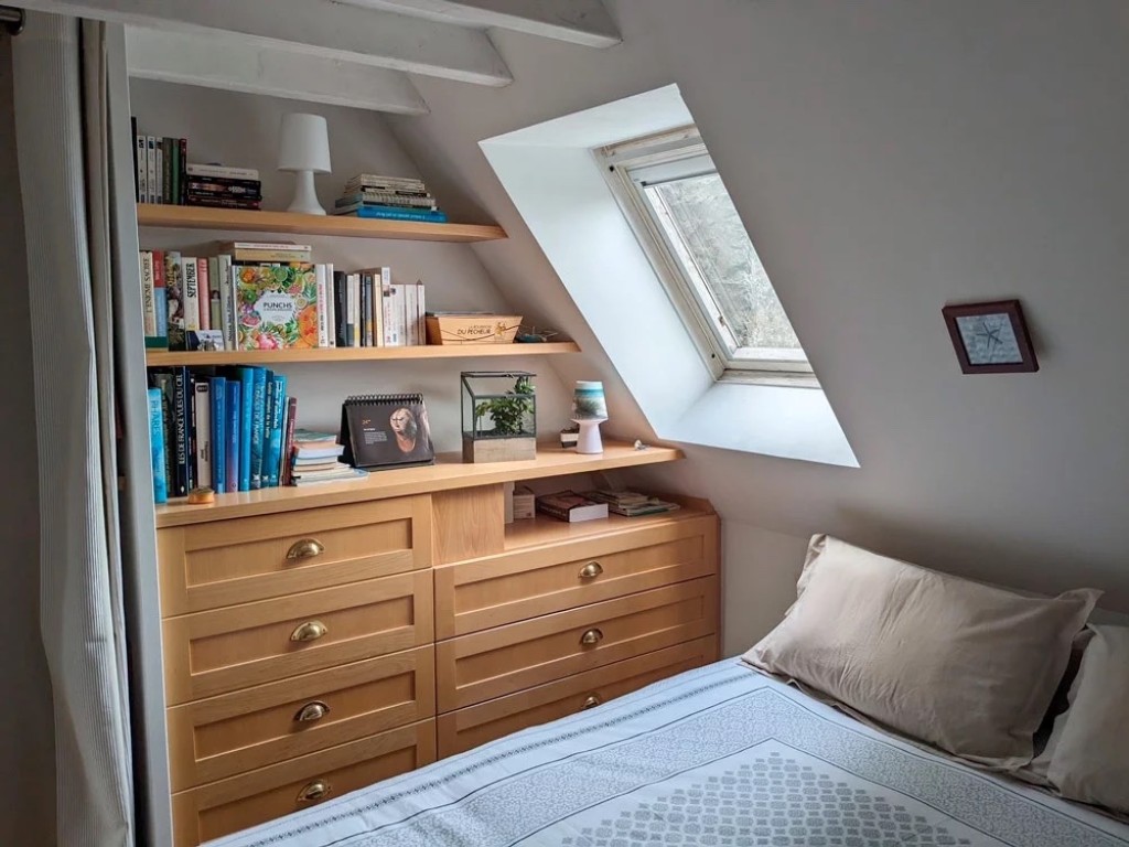 Grâce à un aménagement sur mesure et une conception minutieuse, ce minuscule appartement sous les toits, face à la Tour Solidor, se transforme en un véritable cocon pouvant accueillir jusqu’à 6 personnes. Le mobilier, optimisé dans ses dimensions et ses fonctions, s’intègre parfaitement aux volumes atypiques des combles. Chaque recoin est exploité, chaque circulation est fluide, et les espaces, intelligemment pensés, offrent confort, convivialité et esthétique. Le tout dans une atmosphère chaleureuse et élégante, où chaque détail contribue à la sensation d’espace et de bien-être.