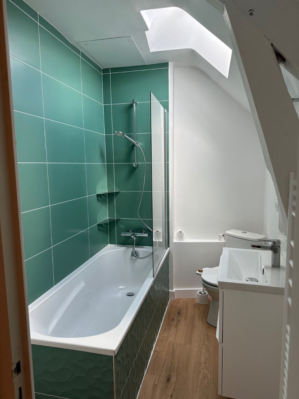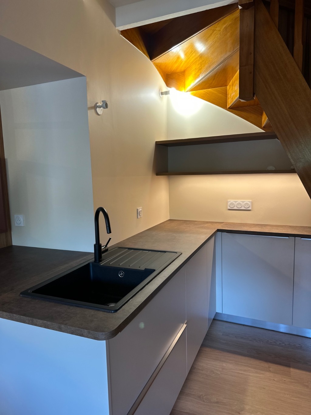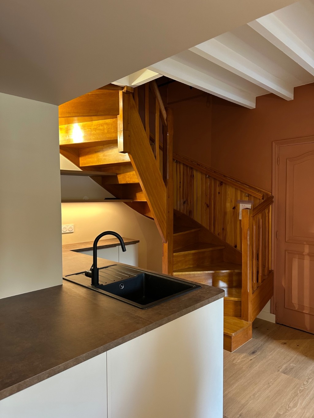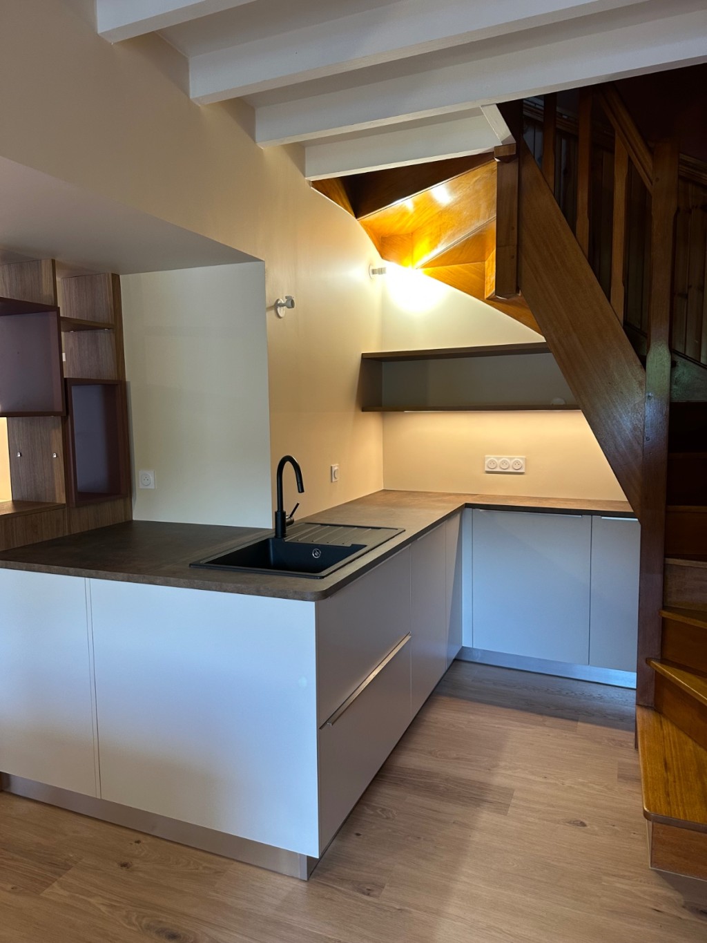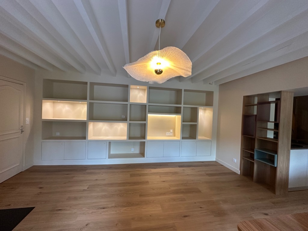 L’ouverture du mur porteur a permis de libérer les perspectives et d’apporter une lumière fluide d’un bout à l’autre du rez-de-chaussée. La cuisine, déplacée et repensée comme une pièce maîtresse, dialogue désormais avec le séjour et la salle à manger, créant un espace convivial et vivant. L’ambiance campagne chic se décline à travers des matériaux naturels, des teintes chaleureuses et des finitions soignées. Un projet qui transforme la maison en un lieu où chaque espace raconte une histoire et invite à partager des moments simples et précieux.