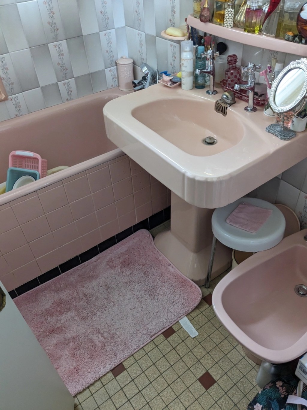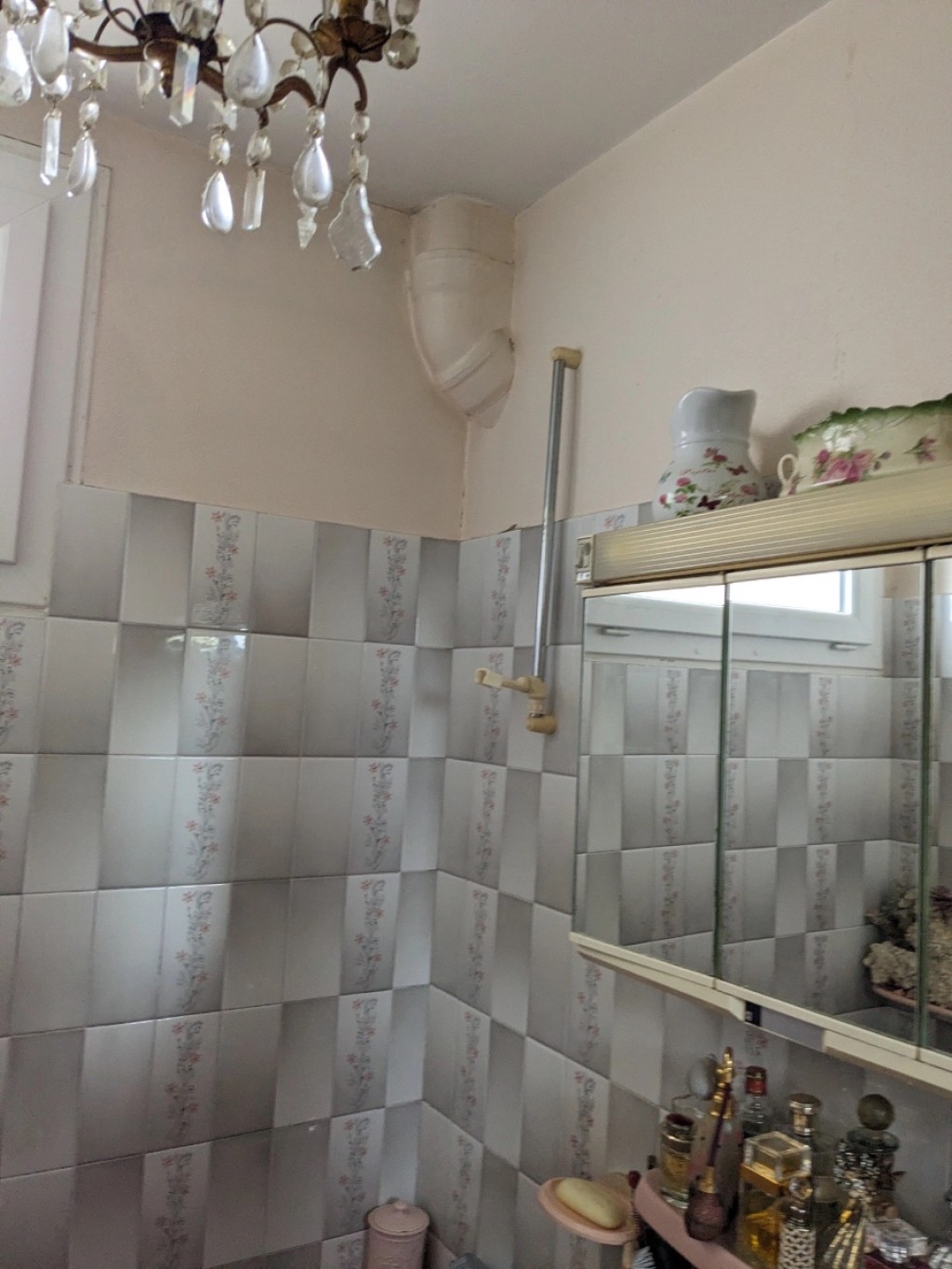 Transformer une petite salle de bain dangereuse en un espace sûr et fonctionnel, sans pour autant perturber les habitudes de notre cliente. Elle tenait particulièrement à conserver son meuble vasque des années 30 et désirait des couleurs spécifiques, principalement des nuances de rose et de gris.