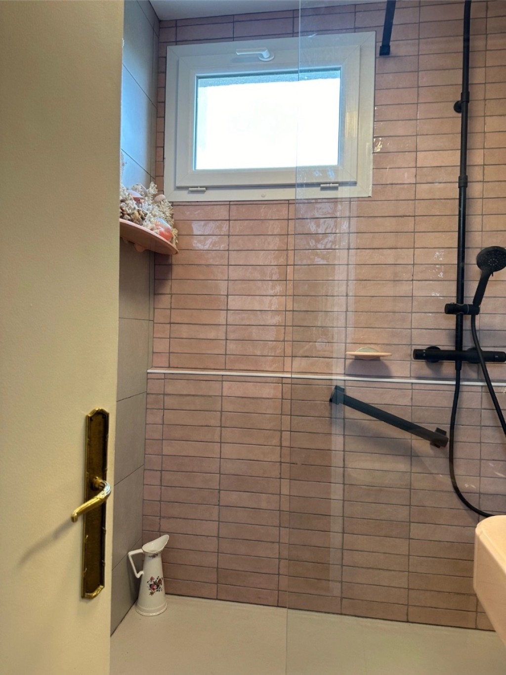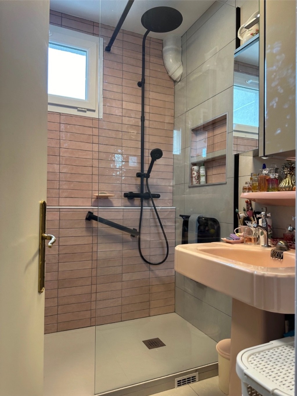 Nous avons entrepris une refonte complète de la salle de bain, en remplaçant la baignoire par une douche moderne et accessible. Afin de respecter les préférences esthétiques de notre cliente, nous avons choisi des carreaux et des revêtements dans des tonalités de gris, avec des touches de rose pour ajouter une note personnelle.