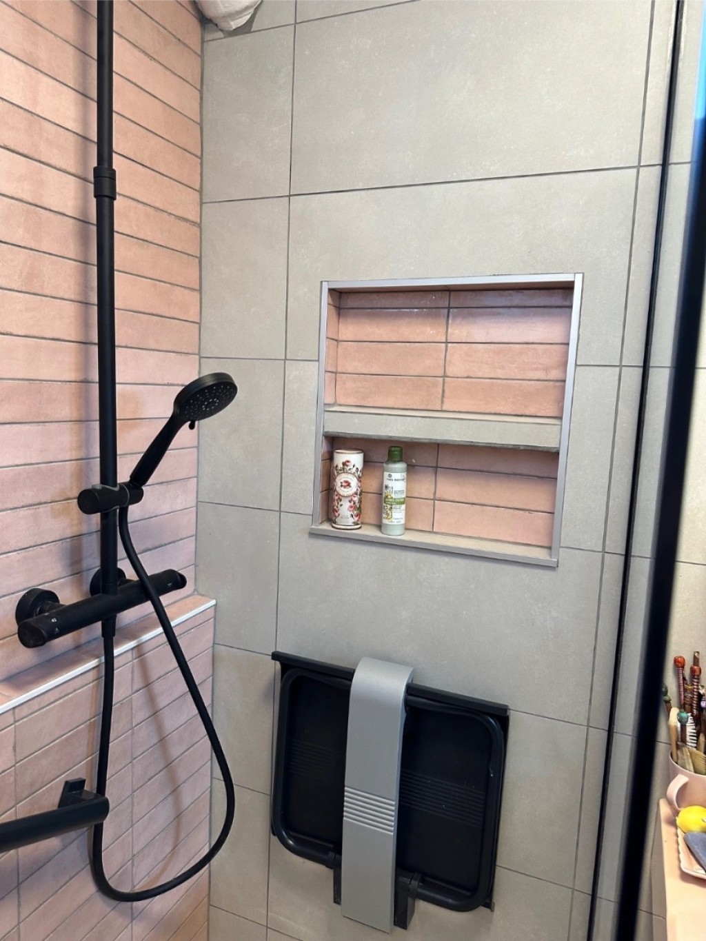 La sécurité était notre priorité absolue. Nous avons intégré des matériaux antidérapants pour le sol et les murs, installé des barres de maintien stratégiquement placées et ajouté un siège esthétique dans la douche. Un petit muret a également été construit pour permettre à notre cliente de poser ses produits et de se rattraper en cas de besoin.